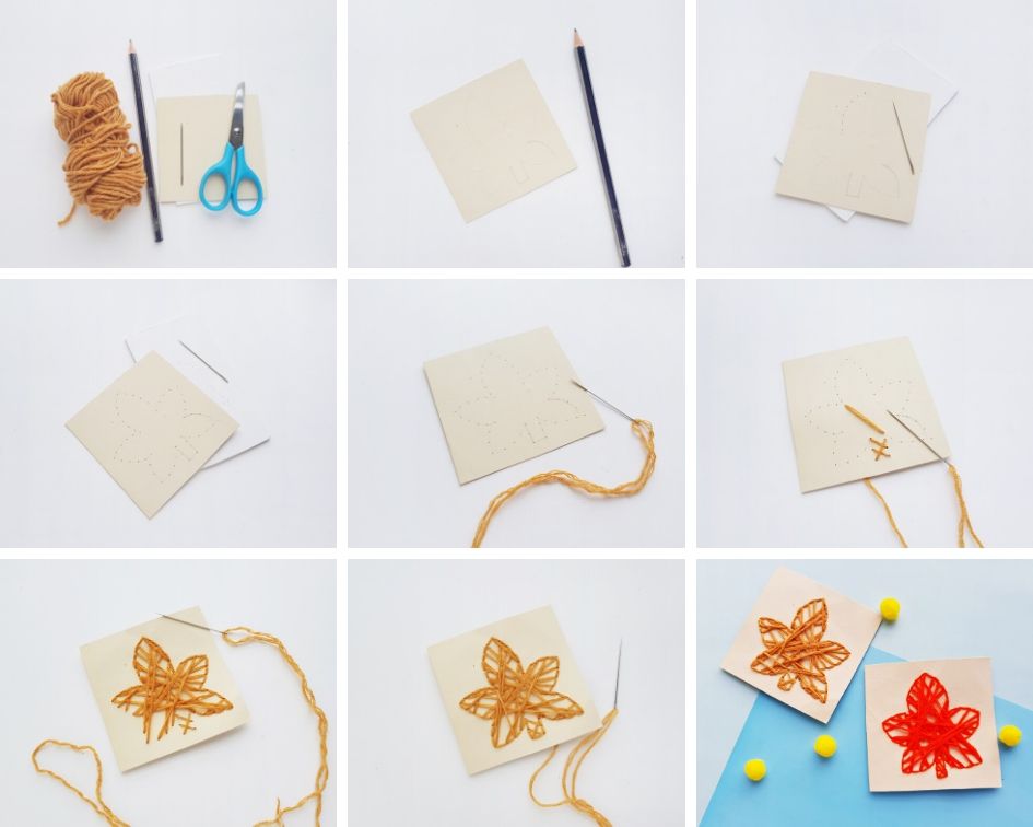 - Start to stitch by drawing the needle from the back side of the cardstock paper and keeping about an inch of the yarn at the back. Go through the holes randomly but try to keep a sequence or try to create a sound pattern.